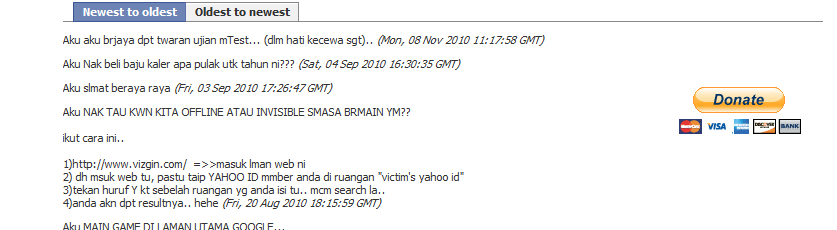 Ermm, sdikit pnmbhan.. kt ctu kt da tulis 'Newest to oldest' dan 'Oldest to Newest'.. Yg Newest to Oldest tu kita tgok status kita yg pling trkini kt atas dan yg yg pling lma kt last skali.. Kalu yg Oldest to Newest plak, paham2 ja la.. Yg lma kt atas, yg baru duk last..